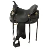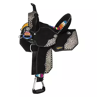 Comfort, function and fun come together to make up the Pecos Saddle. This suede saddle features a classic western look of color complementing tooled leather with buckstitch edged overlays and thick white stitching. The woven serape accents and inlayed seat bring a bit of modern and fun to this saddle. Lighter weight design with a deep seat and high pommel; comfort and function is a guarantee! Classic antiqued silver conchos and aluminum stirrups with rubber tread are the perfect finishing touch. A great saddle for the barrel racer, but also made for everyday use such as trail riding!