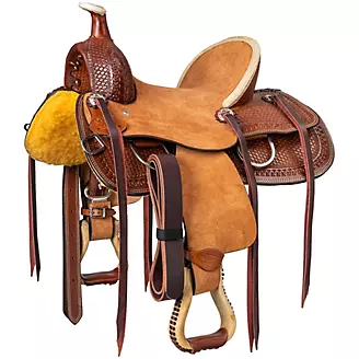 The Royal King Bodie Hard Seat Ranch Saddle is expertly crafted upon a rawhide wrapped fiberglass tree. The rich mahogany rounded skirt is double stitched for strength and is adorned with handsome basketweave and serpentine tooling. Roughout fenders, jockeys, and seat offer the rider improved grip during athletic maneuvers. The antiqued silver conchos feature long saddle strings for attaching all your necessary ranch gear. Finished with drop D rigging, Tough1 Quick Change stirrup buckles, and a rear cinch. A solid built saddle perfect for many western disciplines.