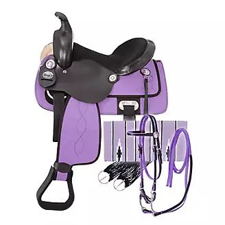 Package includes saddle; matching nylon bridle and reins with leather overlay (includes curb strap and bit); Sierra Navajo acrylic blend saddle blanket; and cord girth.