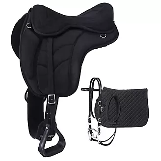 This lightweight and comfortable treeless saddle features a padded, molded synthetic micro-suede seat. Equipped with two dee rings at the front of the saddle and three dee rings along the back of the seat for attaching gear. Designed for long distance endurance and trail riding. Seat detaches so stirrups can be adjusted or removed, converting to a bareback pad. Includes girth, polymer stirrups, and leathers. Great saddle for hard to fit horses or riders seeking a closer contact ride.
